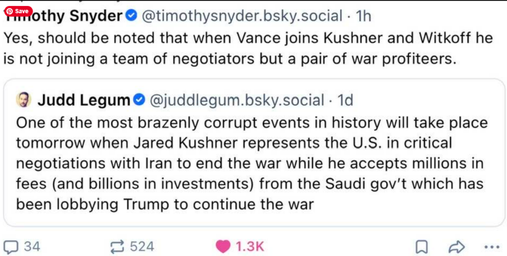 .Witkoff and Trump have also made millions through a cryptocurrency deal with Abu Dhabi last year. I suspect Abu Dhabi has some opinions about what’s been going on in the Strait of Hormuz.